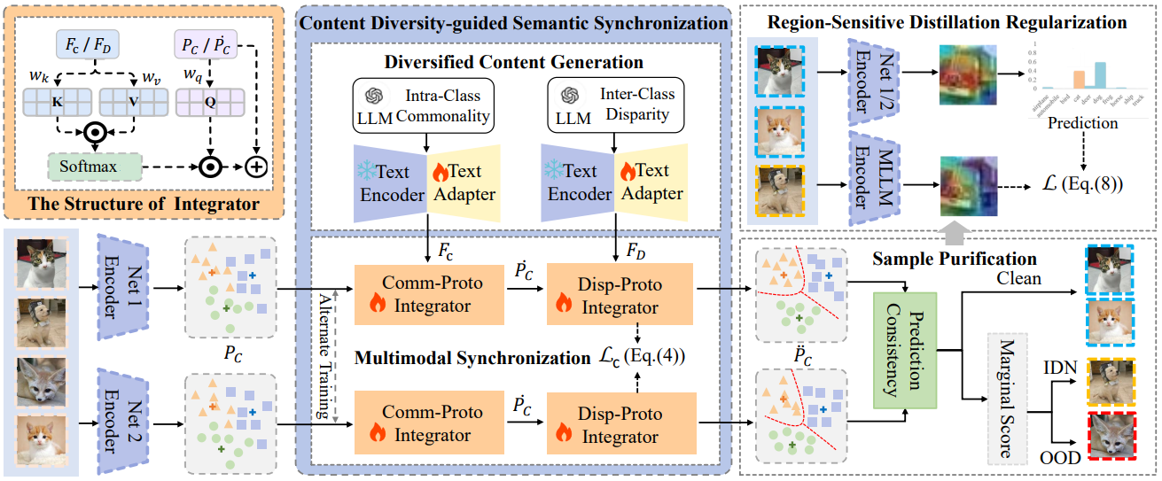 论文概述:在开放集噪声标签学习中,由于训练数据同时包含分布内噪声样本与分布外噪声样本,模型易产生过度自信却错误的预测。针对这一问题,论文提出了一种内容多样性引导的模糊性缓解框架,通过利用多样化的文本信息来解决开放集噪声标签学习中的语义缺陷问题。该框架通过引入文本描述的类内共性与类间差异来动态细化语义边界,以缓解视觉模糊性并减少原型学习偏差;同时设计了一种区域敏感的蒸馏正则化方法,将多模态大语言模型中的边界感知知识迁移至目标视觉模型,从而抑制早期视觉表征的不确定性。在不同数据集和噪声水平上的实验表明,这一方法有效提升了模型性能,其效果优于现有最先进方法。