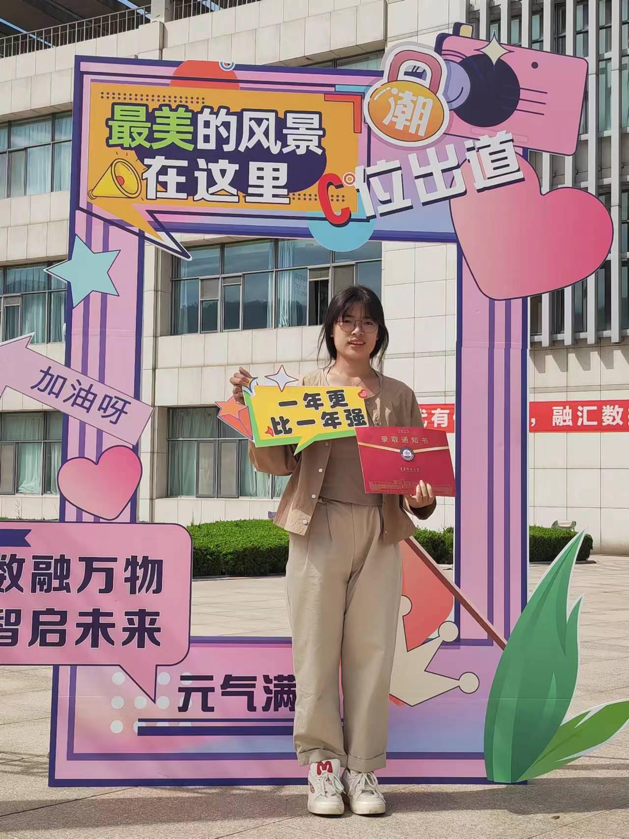 迎新现场,学院精心布置了体现学院特色和专业方向的欢迎展板、横幅,并在通往学院的阶梯贴上温暖、活泼的心形标语,还结合“00后”萌新特点准备了丰富多样的网红创意打卡墙、手持小标语、手绘地图等。为方便家长歇息,学院在迎新现场设置“家长休息区”和“行李存放处”,为随行家长提供了暖心服务。在展板和打卡墙前,新生纷纷拍照留念,把入学第一天的美好画面定格成永恒的记忆,仪式感满满,帮助新生打消刚刚步入校园的紧张和局促,也让新生们感受到学院以“心”迎新的诚意与热情。