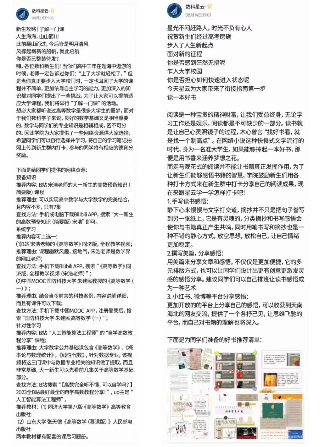 学院在新生拿到录取通知书的那一刻就给学生在线上建家,全院教师积极参与线上师生互动,解答新生的问题,同时给新生推荐了20本涉及心理健康、生涯规划、历史文学、专业科普等经典书目,鼓励新生在暑假期间选择2-3本进行学习。介绍了高等数学线上预习课程平台,要求新生提前预习大一核心课程。新生“未入校,先入学”,使新生提前做好入学的各项准备。学生通过笔记、美篇、微博、QQ群等方式打卡分享读书感悟、学习情况。