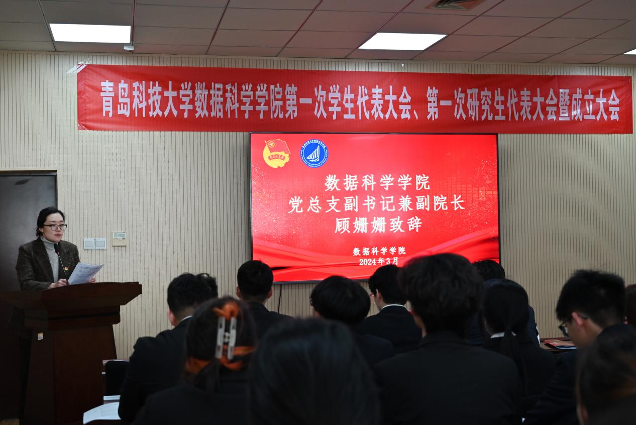 接着,顾姗姗发表讲话,她向大会的召开表示热烈祝贺,向与会嘉宾和代表们表示诚挚问候和美好祝愿。顾姗姗鼓励同学们努力提升专业素养与创新能力,更好融入国家创新体系建设,谋好创新这篇大文章,为中国式现代化建设贡献青年力量,同时希望以本次大会的召开为契机,继承和发扬学院优良传统,站在新的历史起点,凝心聚力,锐意进取,共同为学院奋力开创高质量发展新局面继续努力奋斗。