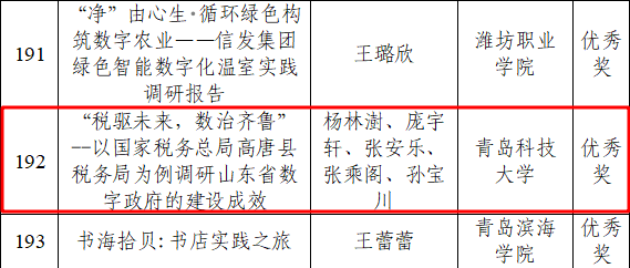 此次活动以“情系桑梓‘数’向未来”为主题,活动开展以来,得到了各市学生的广泛关注和积极响应,经专家评选和审议,最终确定获奖作品200个、优秀组织单位22家,优秀指导教师165名。星空XK官网辅导员卞文馨获优秀指导教师荣誉称号,《数字赋能乡村振兴:电商实践与未来展望》《推动智慧政务与数字化城市管理:实践与探索》《税驱未来,数治齐鲁——以国家税务总局高唐县税务局为例调研山东省数字政府的建设成效》三项调研作品荣获优秀奖。调研作品深度结合习近平总书记关于网络强国、数字中国建设的重要论述,通过为期四到五周的数字化服务活动,围绕“数字+”领域对数字化建设成效进行总结并提出有关建议。