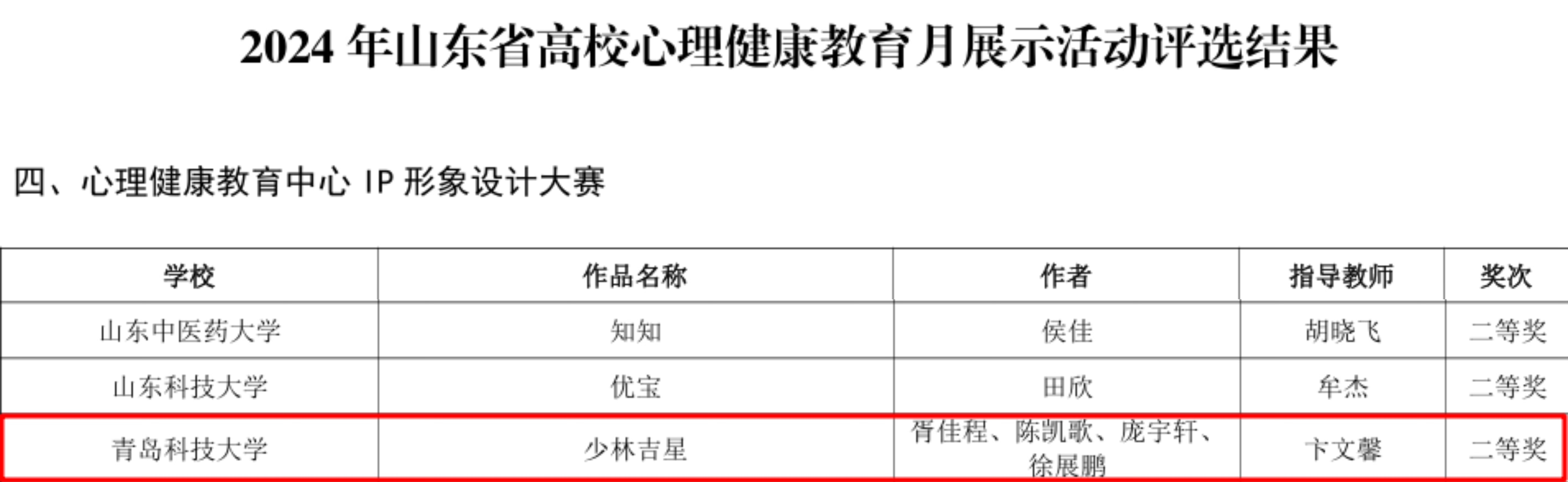 近日,山东省高等学校思想政治教育研究会、大学生心理健康教育专业委员会公布了2024年山东省高校心理健康教育月展示活动评选结果,星空XK官网《少林吉星》获得心理健康教育中心IP形象设计大赛二等奖。