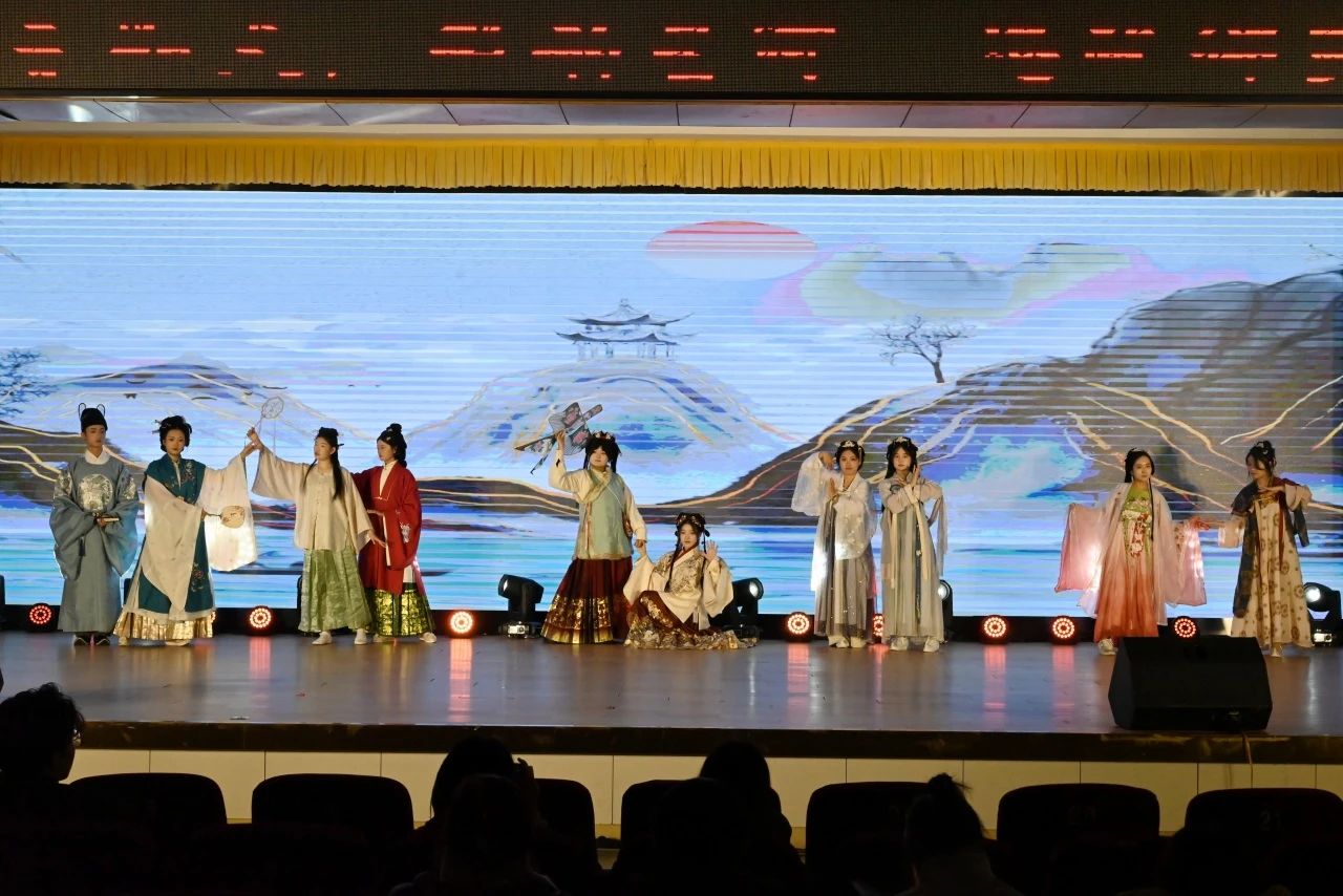 汉服走秀《春日宴》中,汉韵研习社成员身着精美汉服,演绎古典之美,让观众领略中华传统文化的独特魅力;