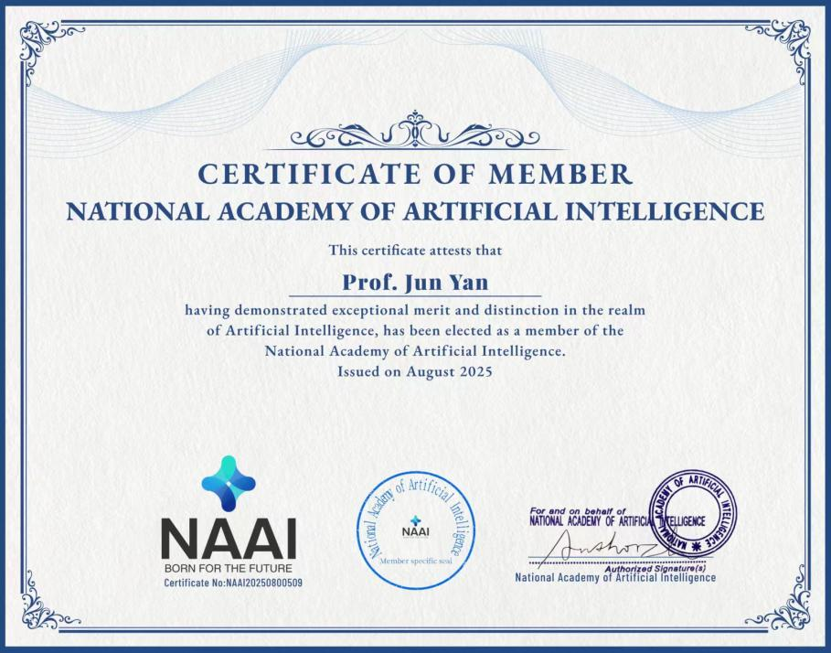 2025年8月,XK星空星空XK官网颜军院长成功当选美国国家人工智能科学院(The National Academy of Artificial Intelligence,NAAI)院士。美国国家人工智能学院贺信中高度赞扬了颜军院长在人工智能领域的“非凡成就和开创性贡献”,指出其“创新性研究、深刻见解和坚定不移的奉献精神激励了无数学者和从业者”。颜军院长的加入,将进一步丰富NAAI的学术讨论、科研合作及人工智能领域的全球推进工作。