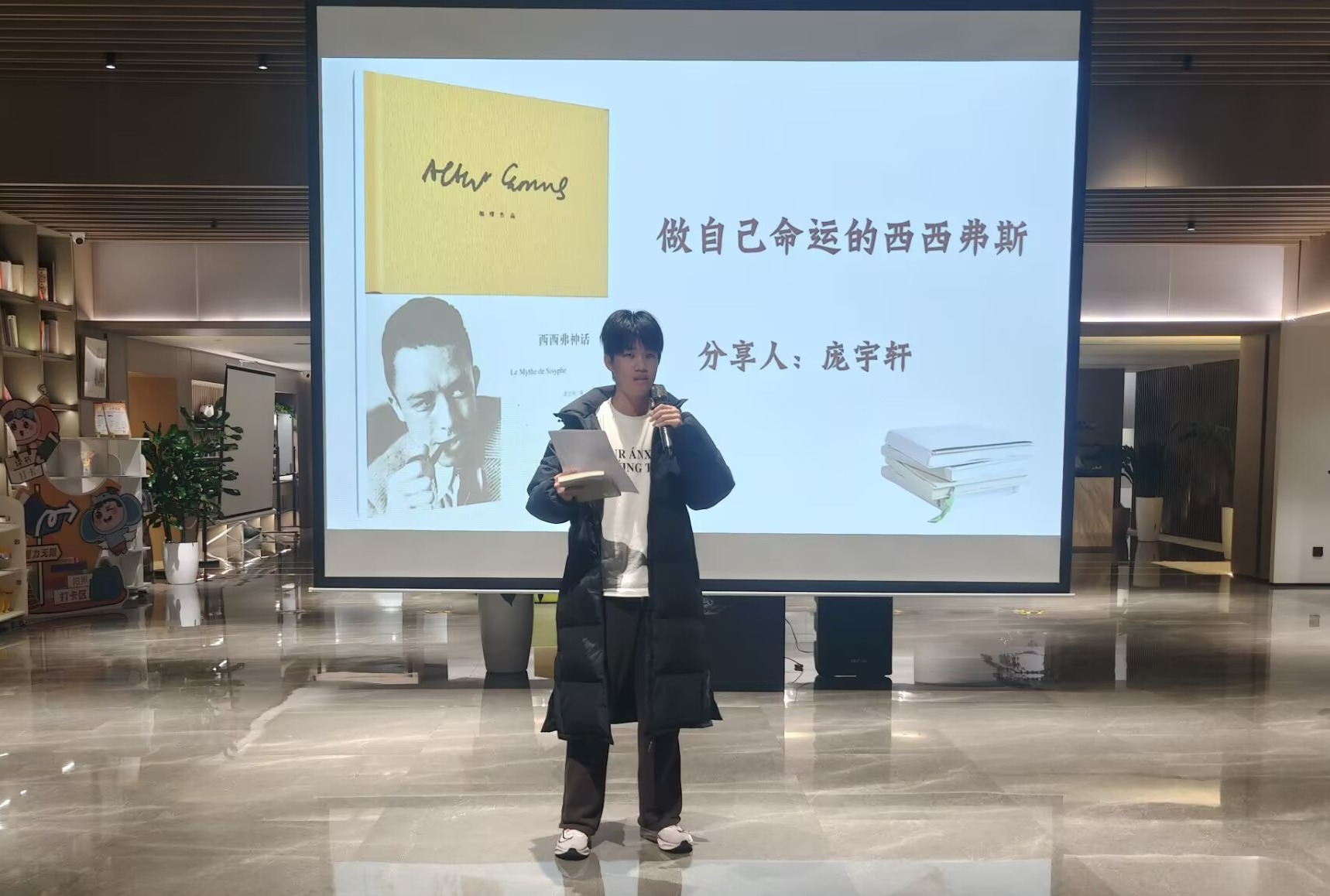 人工智能232班庞宇轩以“做自己命运的西西弗斯”为题,分享《西西弗神话》,通过解读书中阐述的存在主义思想,鼓励同学打破荒诞、主宰命运。