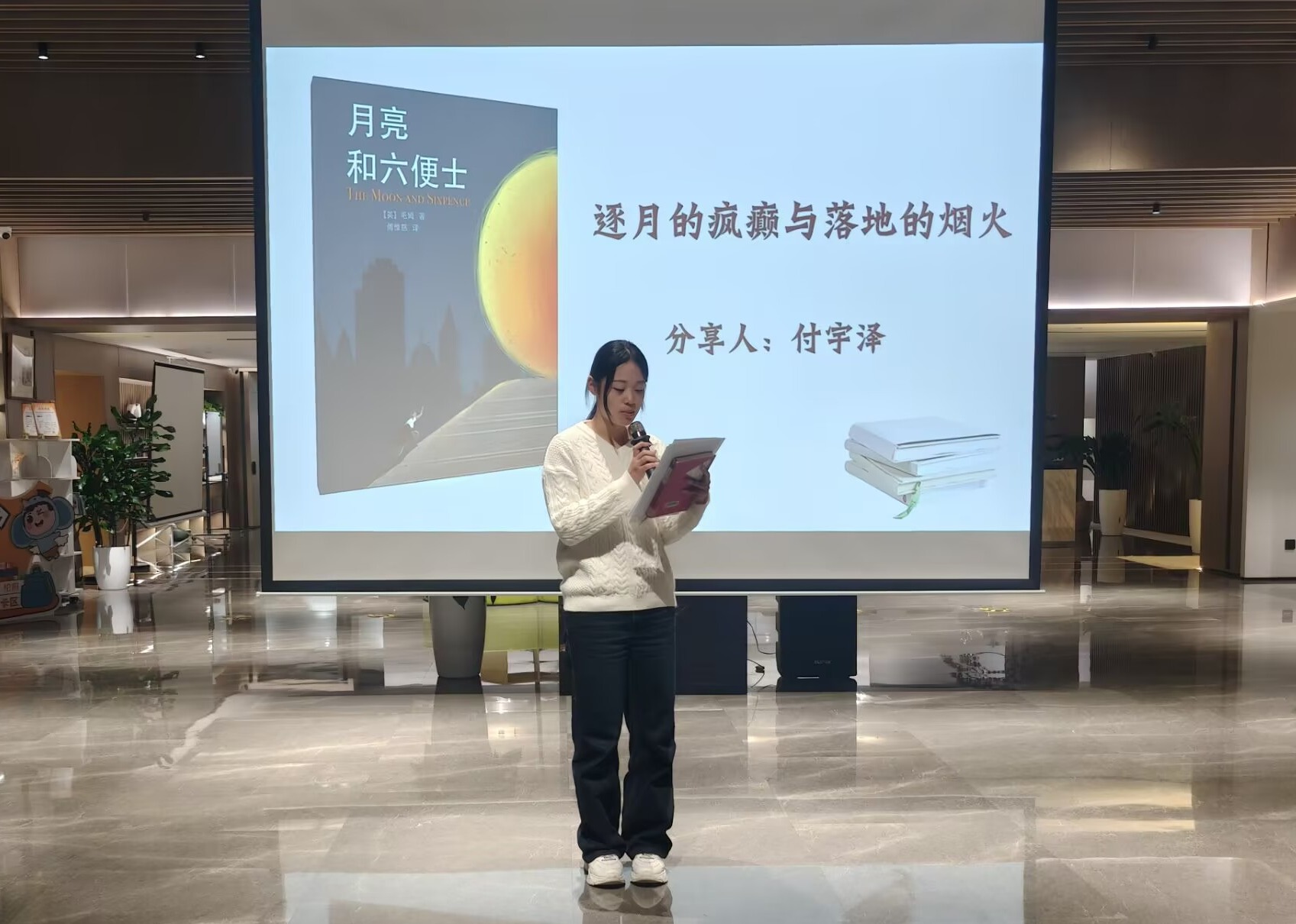 大数据252班付宇泽以“逐月的疯癫与落地的烟火”为题,分享《月亮与六便士》,探讨理想与现实关系,结合主人公抉择,引发对坚守理想与兼顾责任的思考。