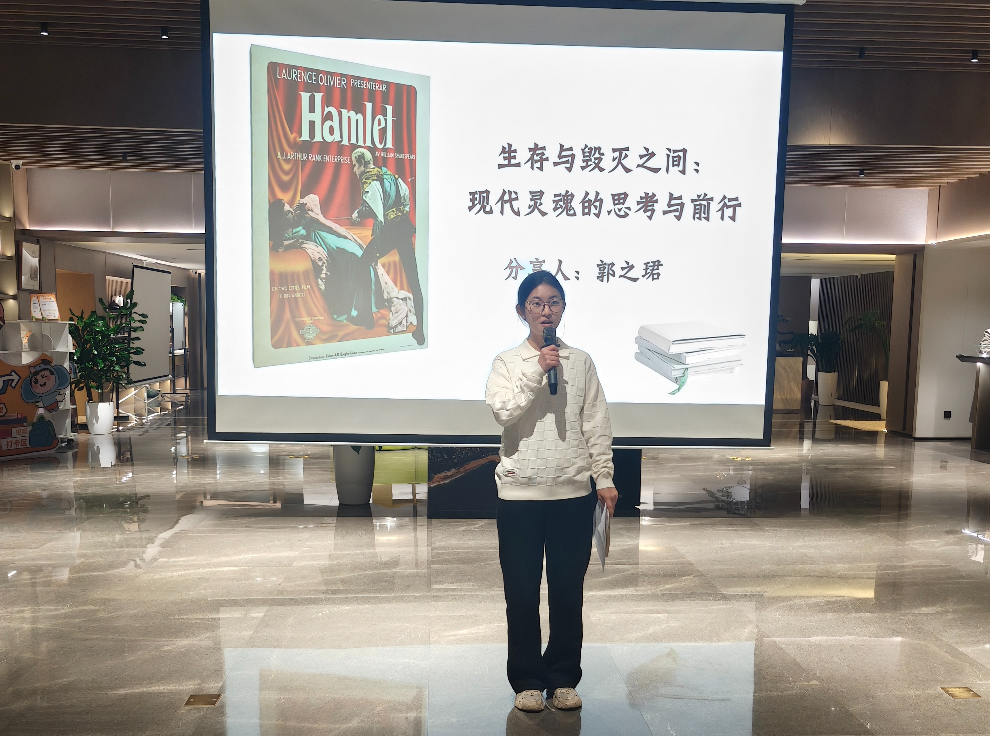 大数据252班郭之珺以“生存与毁灭之间:现代灵魂的思考与前行”为题,分享《哈姆莱特》,引导同学们在迷茫中思考抉择,保持对生活的清醒认知。