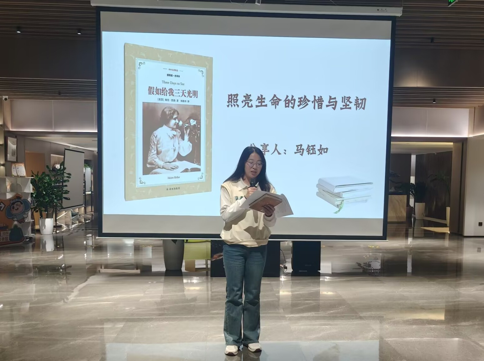 人工智能254班马钰如以“照亮生命的珍惜与坚韧”分享《假如给我三天光明》,以海伦·凯勒经历为核心,诠释以坚韧的心态面对生活中的挑战的意义。