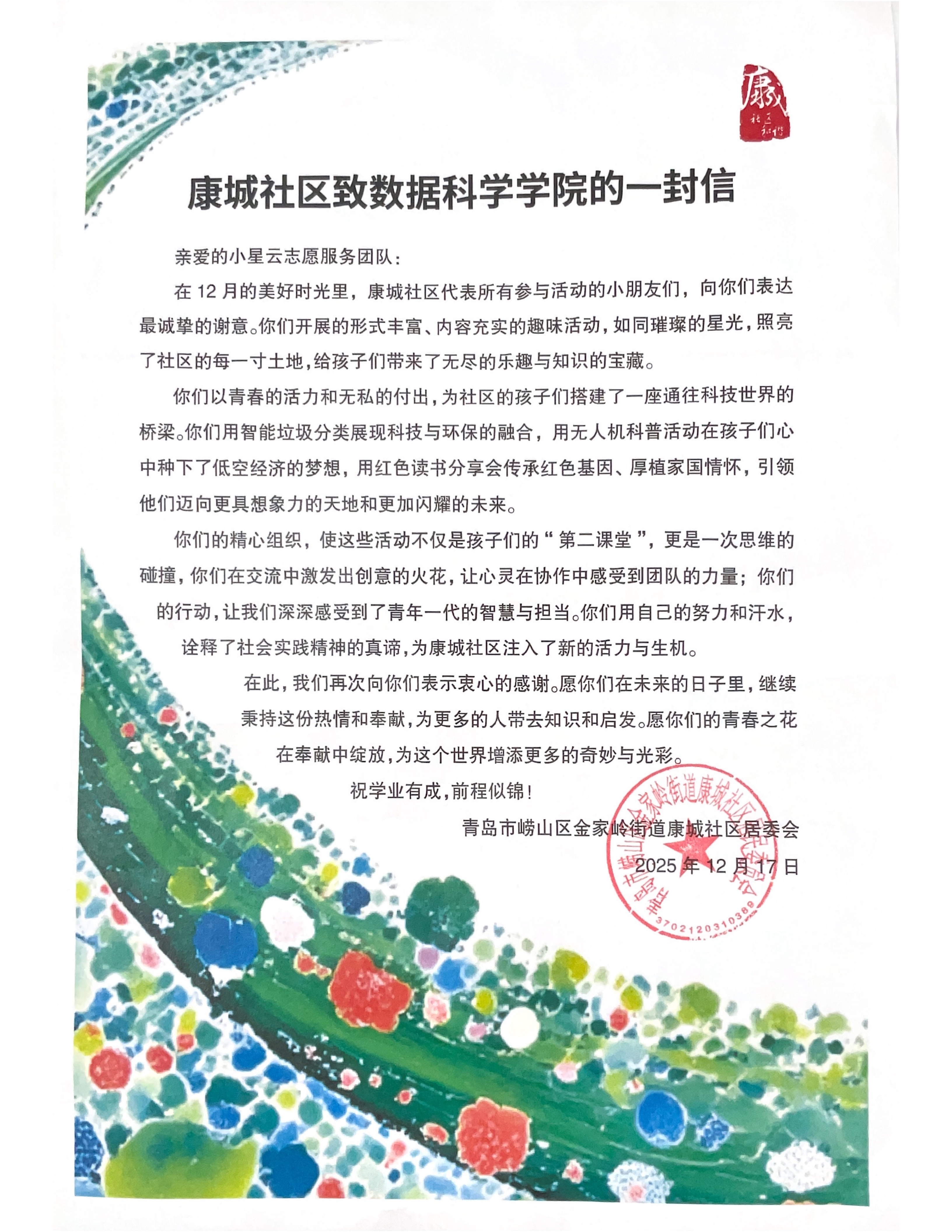 为传承红色基因、厚植青少年家国情怀,响应科技强国战略号召,充分发挥高校服务社会职能,12月,星空XK官网“小星云”志愿服务团队走进青岛市崂山区金家岭街道康城社区,开展系列主题志愿服务活动。“小星云”志愿服务团队以青春担当传递知识温度与成长力量,系列活动获得康城社区居委会、学生家长及青少年群体的高度认可与广泛好评。社区居委会专门致信表达诚挚谢意,充分肯定了志愿服务的专业价值与深远意义。