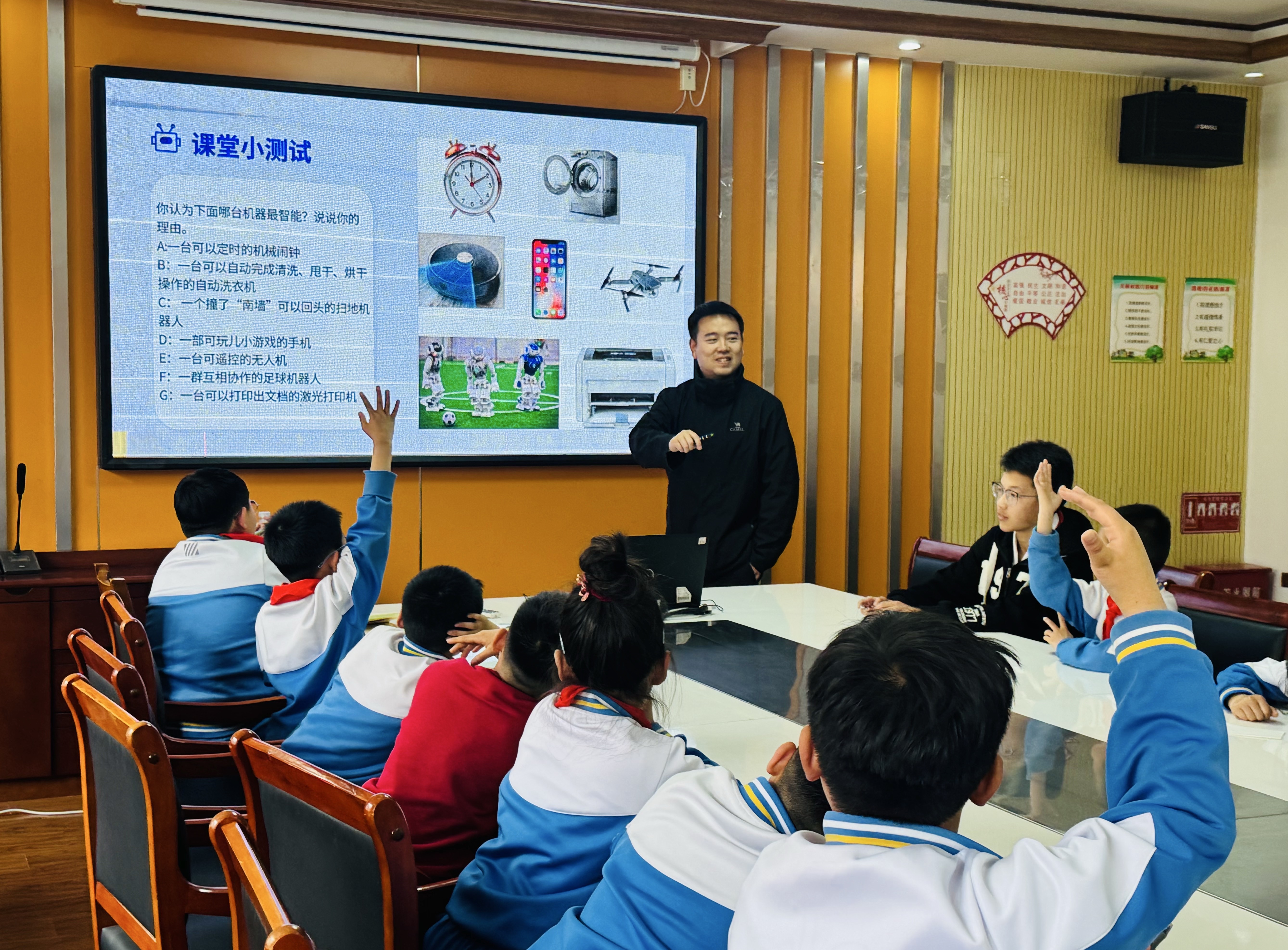 在互动环节,设计了趣味问答、情景模拟等环节,围绕“什么是AI”“AI能做什么”“我们身边有哪些AI”等问题与同学们积极互动。孩子们踊跃举手、积极发言,大胆分享自己对人工智能的理解和想象,有的问“AI能帮我们写作业吗”,有的说“我见过能说话的智能音箱,这就是AI吧”,课堂气氛十分活跃。宣讲团成员耐心解答每一个疑问,进一步帮孩子们理清认知,加深对人工智能的理解。