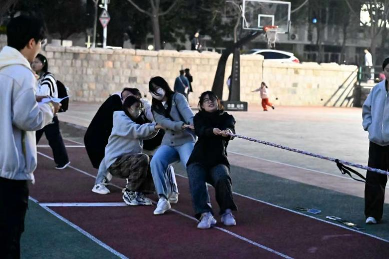 本次比赛科学设置竞赛组别,同学们自主组建队伍,其中男生组每队十人、女生组每队五人,合理的赛事安排保障了活动有序开展。比赛正式开始后,随着裁判哨声吹响,各参赛队伍迅速进入状态。队员们紧握绳索、稳扎马步、凝心聚力,充分彰显坚韧奋进的青春姿态。赛场之外,围观同学热情高涨,热烈的氛围贯穿全程,让赛场活力持续升温。