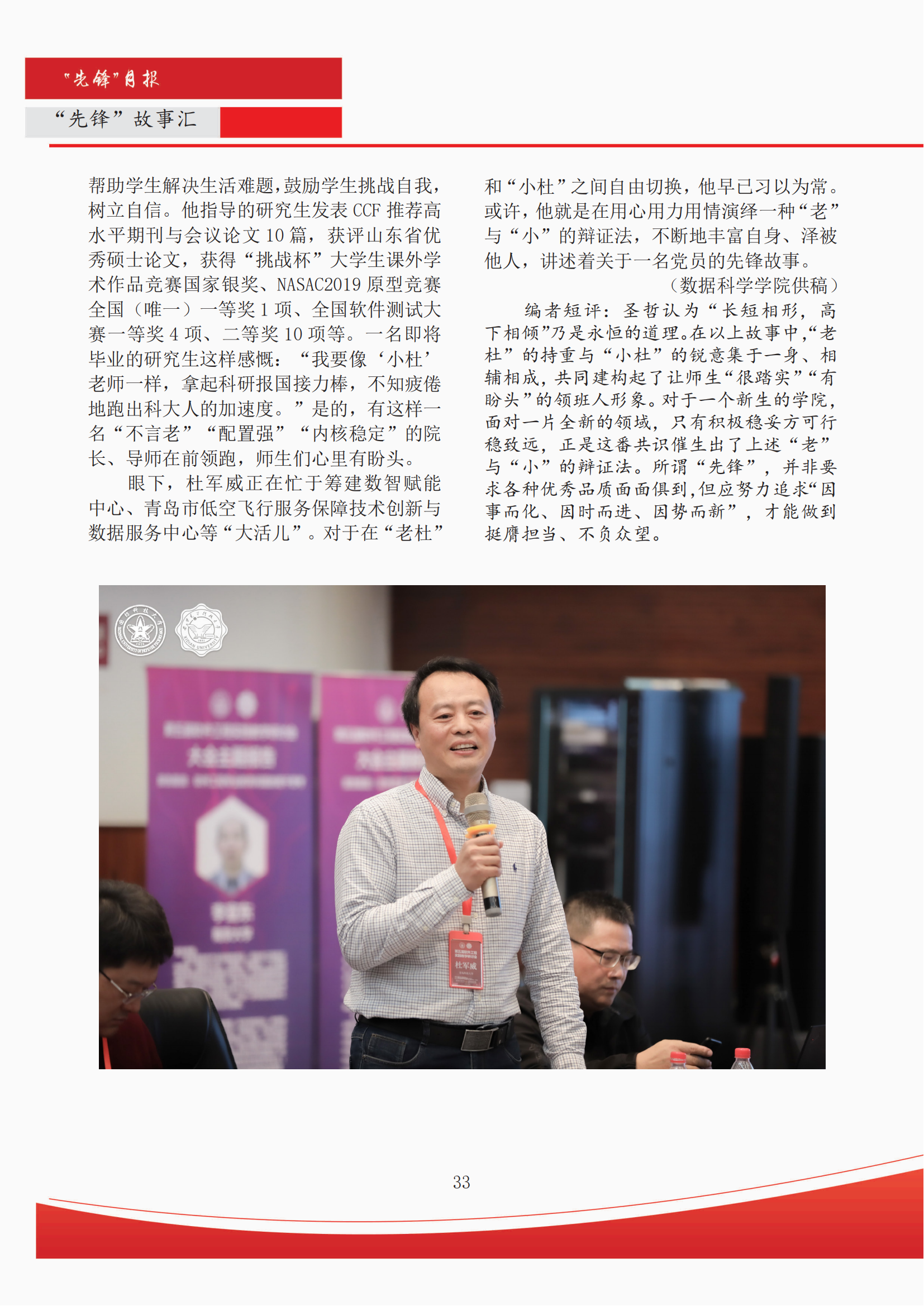 学院的青年教师说起这位杜院长,几乎众口一词:“杜院长常挂在嘴边的一句话‘这个时候不干,什么时候干’。只要对学院、对学生、对教师发展有利的事情,他总是不遗余力的推进,那劲头就像小伙子一样。在他的带动下,我们也都特别有干劲。”如此一来,“小杜”的说法不胫而走,在师生们之间广为流传。为了加速推进“精、专、强”现代产业学院建设,“小杜”总是身先士卒,冲在一线,带领全院上下争分夺秒地布局学科平台建设、学位点的申报、人才引进等工作,没白没黑、加班加点已是常态,这种始终“在线”的精气神儿和堪称“硬核”的工作状态让老师们无不敬服。而对于学生,“小杜”亦师亦友,总能以自身的平实、奉献与激情,成为大家眼中没有架子、没有私心、没有“代沟”的好老师。他自费为研究生购买服务器、云存储资源,不断优化研究生培养硬件环境;他资助学生参加国内外学术会议,定期邀请知名学者与学生探讨学术前沿,优化人才培养的软环境;他关心学生生活,帮助学生解决生活难题,鼓励学生挑战自我,树立自信。他指导的研究生发表CCF推荐高水平期刊与会议论文10篇,获评山东省优秀硕士论文,获得“挑战杯”大学生课外学术作品竞赛国家银奖、NASAC2019原型竞赛全国(唯一)一等奖1项、全国软件测试大赛一等奖4项、二等奖10项等。一名即将毕业的研究生这样感慨:“我要像‘小杜’老师一样,拿起科研报国接力棒,不知疲倦地跑出科大人的加速度。”是的,有这样一名“不言老”“配置强”“内核稳定”的院长、导师在前领跑,师生们心里有盼头。