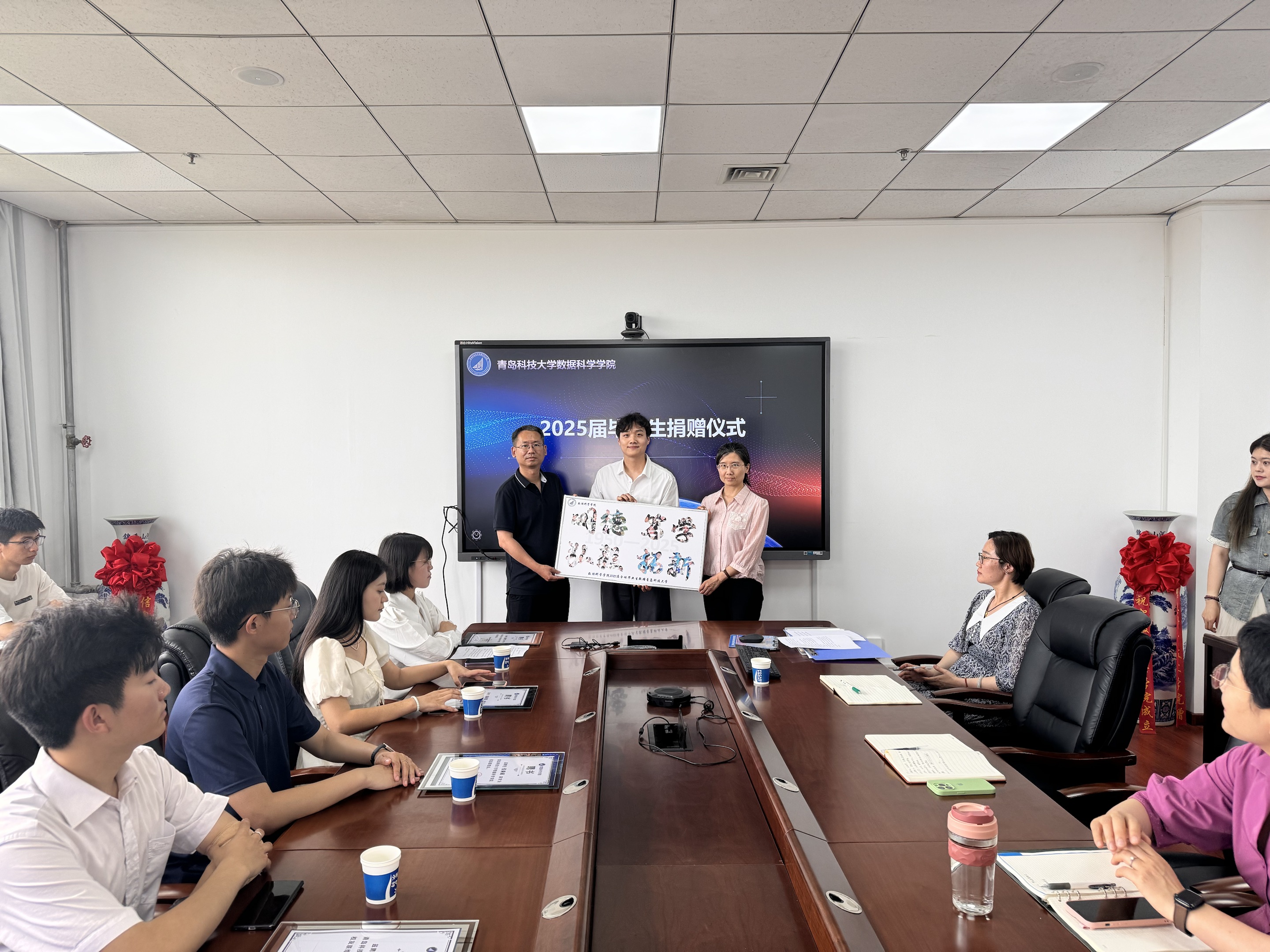 毕业生代表曹远泽向学院赠送AI主题画作《以AI启航,逐梦青科》,张淑军、李辉共同接受这份饱含创意与温情的礼物。画作以人工智能元素为核心,象征着数据科学学子以专业所长逐梦未来的决心,也寄托了毕业生对母校的眷恋之情。