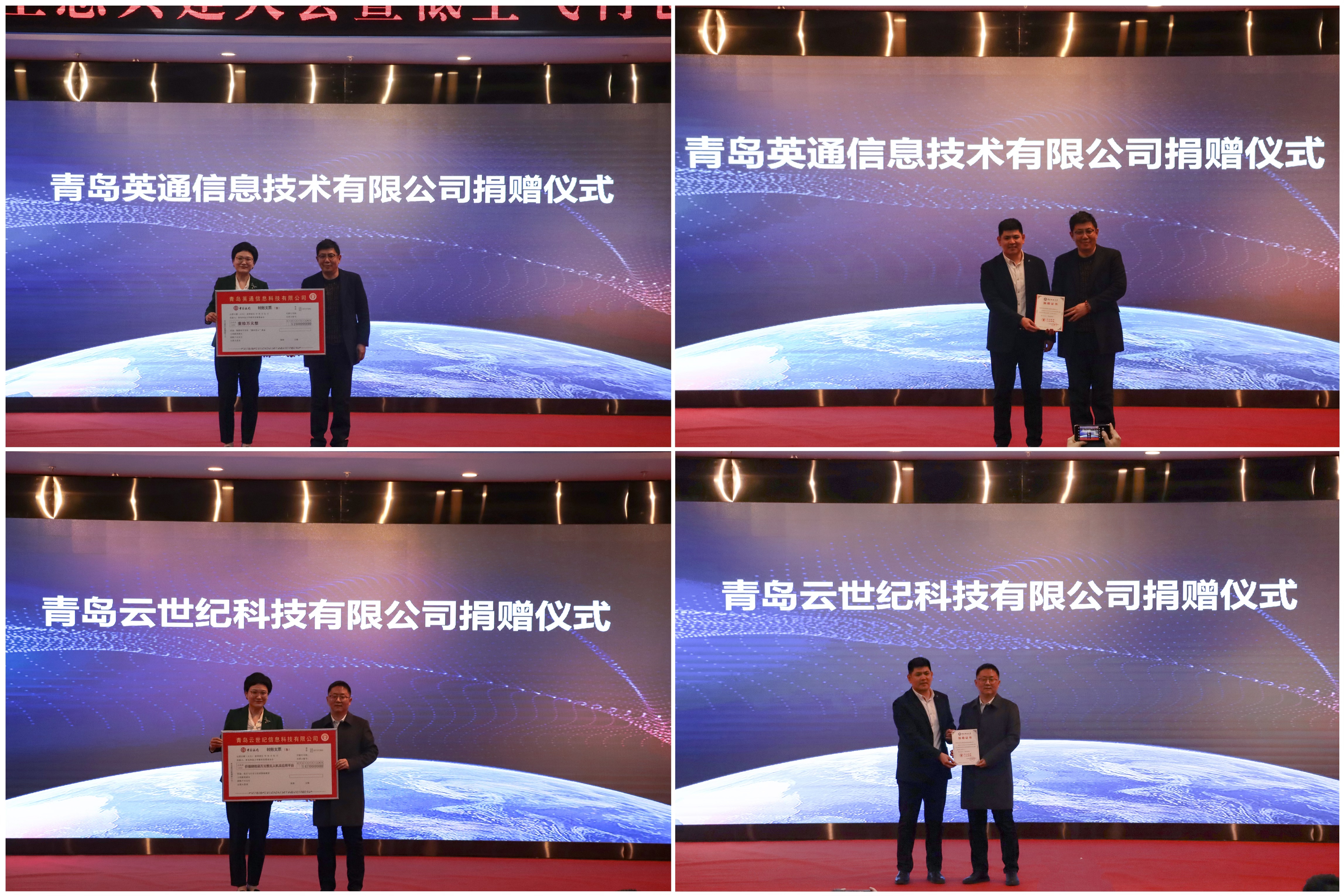 合作发展处处长兼校友工作办公室主任王帅为青岛英通信息技术有限公司、青岛云世纪科技有限公司颁发捐赠证书。