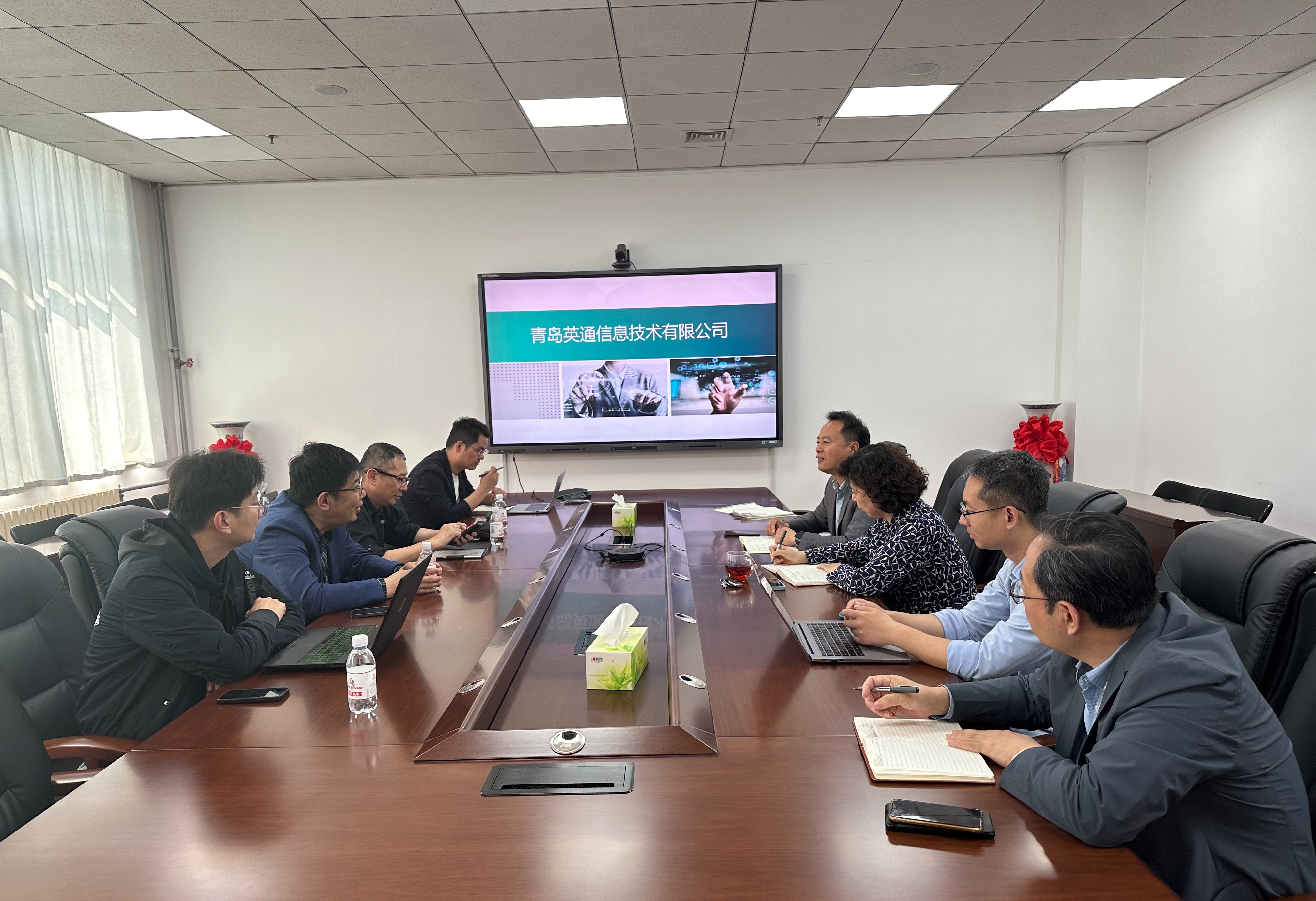 杜军威对刘鹏一行的到来表示欢迎,并介绍了学院的基本情况和科研力量。他表示,青岛英通信息技术有限公司的需求和学院学科专业发展非常契合,期待双方加强合作,共同推动创新人才联合培养、科技成果转化和产业化。