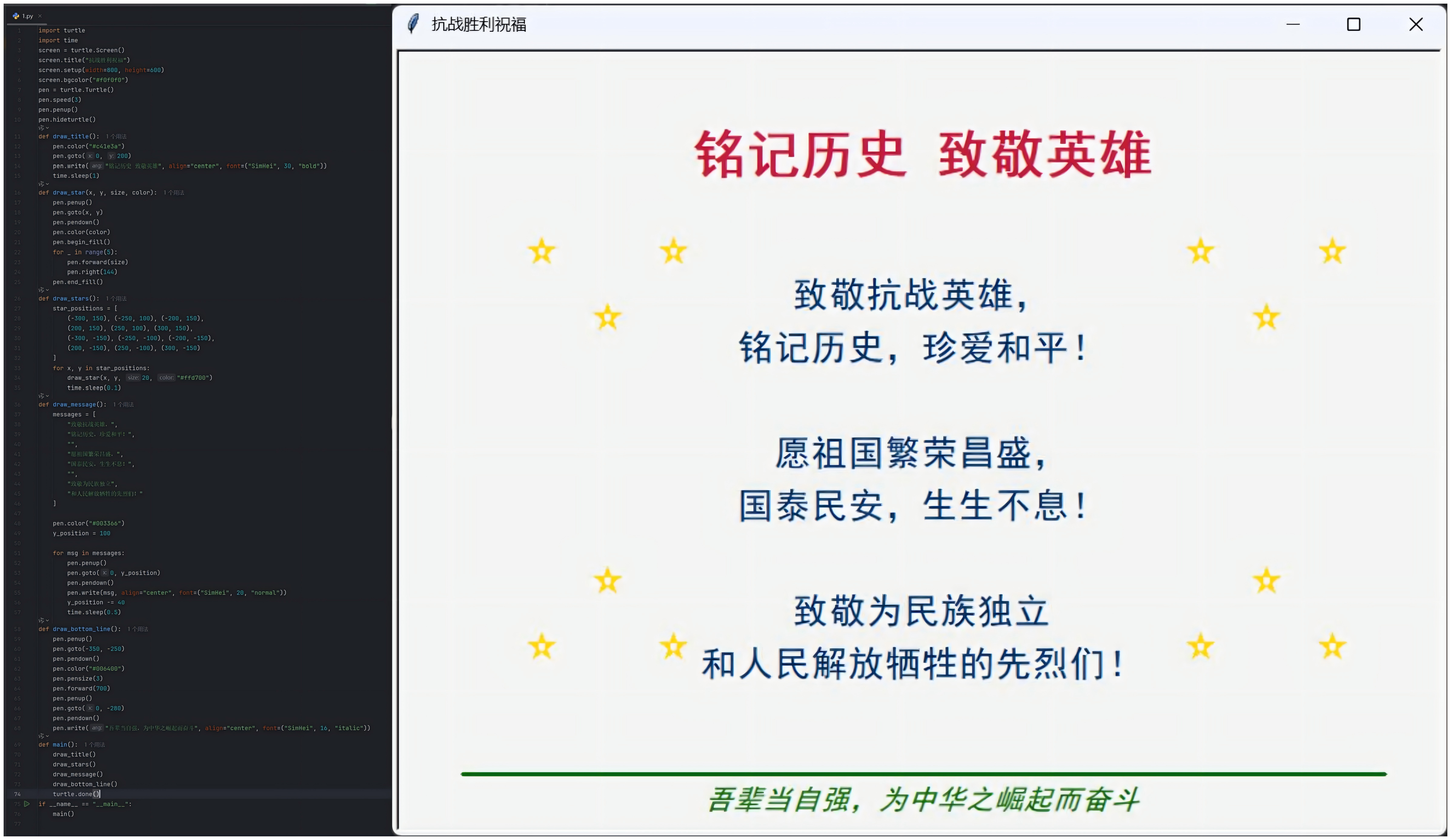 学院学生会发起“三行代码颂祖国”实践活动,将专业教学与红色教育深度融合。师生以Python、C++等编程语言为核心载体,创新采用时间轴标注(串联抗战关键节点)、动态文字生成(呈现爱国语句)、红色地标像素绘制(还原抗战纪念场景)等形式,把抗战历程的厚重历史与爱国情怀的精神内核融入代码创作,共征集并筛选出逻辑清晰、创意鲜明的优秀作品50余件,让红色故事通过数字载体更生动地传播。谈及此次活动设计的初衷,学院社团指导教师卞文馨说,“策划‘三行代码颂祖国’活动,旨在引导学生将铭记历史与时代担当紧密结合。我们希望通过这种专业实践,让学生深刻理解,专业学习绝不仅仅是掌握技术技能,更是一种表达情感、传承精神的重要工具,是赋能爱国主义教育的新途径。”