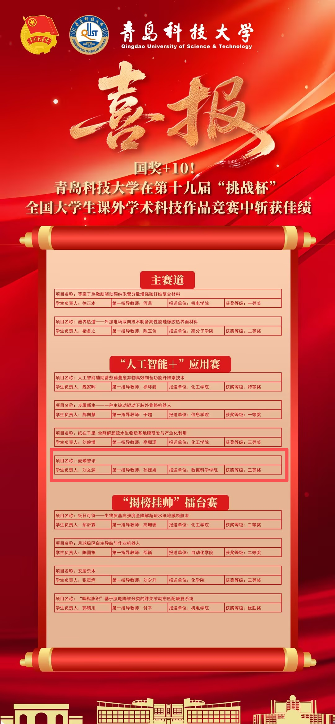 10月31日至11月3日,由共青团中央、中国科协、教育部、中国社会科学院、全国学联和江苏省人民政府共同主办,南京大学承办的第十九届“挑战杯”全国大学生课外学术科技作品竞赛终审决赛在南京大学仙林校区举行。星空XK官网参赛项目“麦磷智诊”(学生负责人:刘文渊,第一指导教师:孙媛媛)斩获“人工智能+”应用赛三等奖。