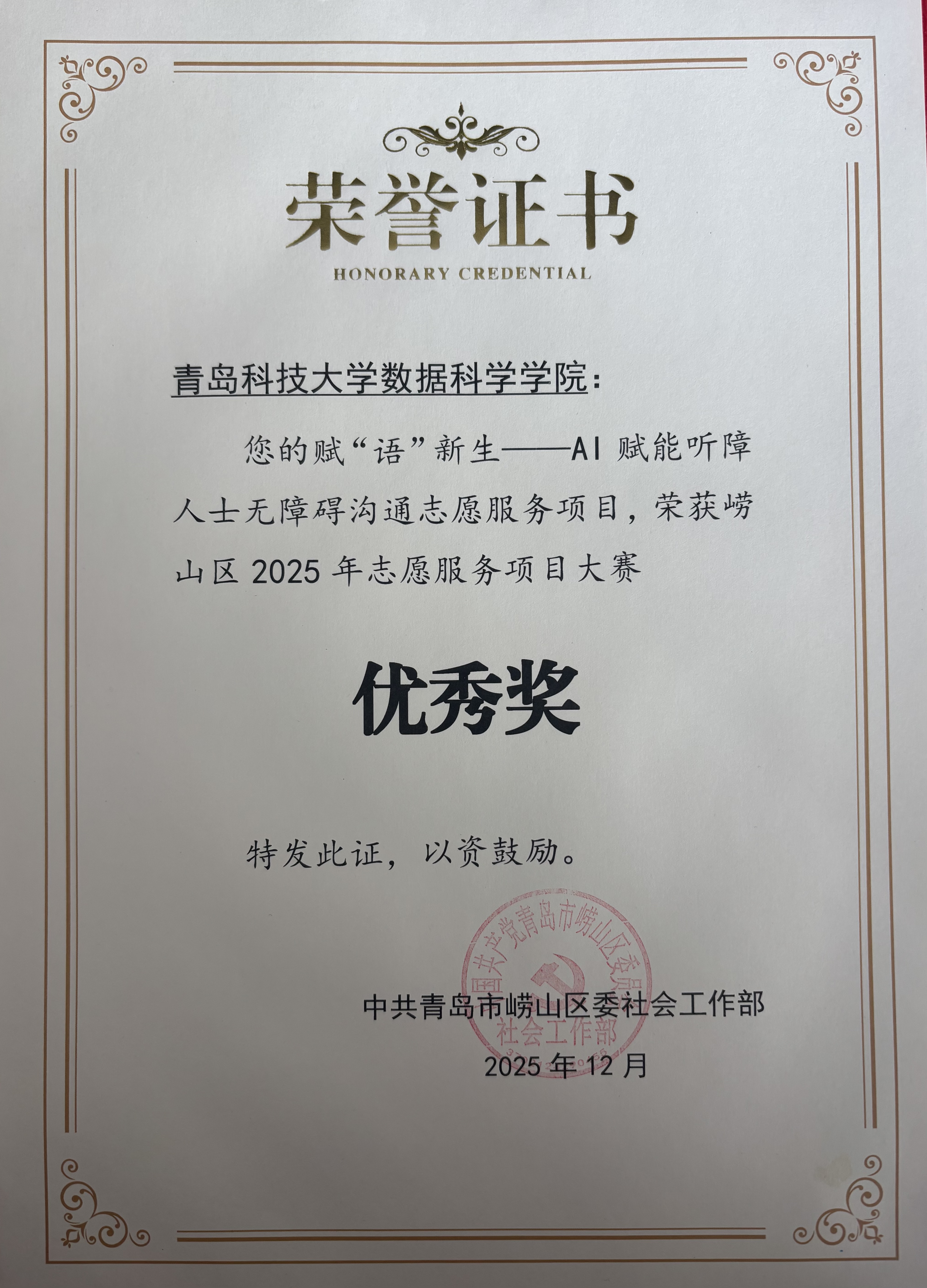 12月5日,在第40个“12·5”国际志愿者日系列活动期间,星空XK官网“小星云”志愿服务队的“赋‘语’新生——AI赋能听障人士无障碍沟通志愿服务项目”在青岛市志愿服务项目大赛中荣获优秀奖,并受邀参与志愿服务主题交流活动,与各获奖代表及志愿服务组织共话志愿力量凝聚与服务创新。