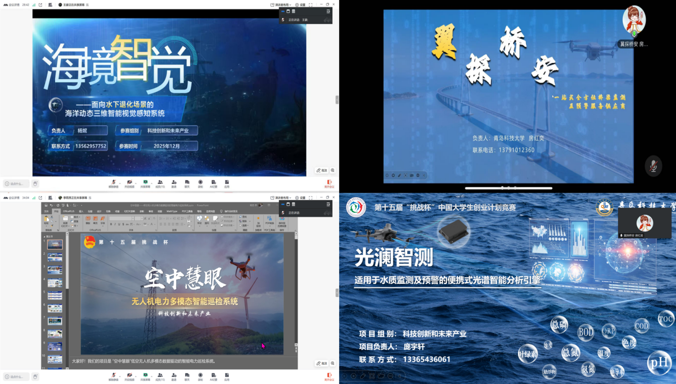 各团队依次进行线上路演展示。项目选题广泛覆盖海洋监测、桥梁检测、水下视觉等方向,既锚定国家战略要求,又体现学生科技创新成果。