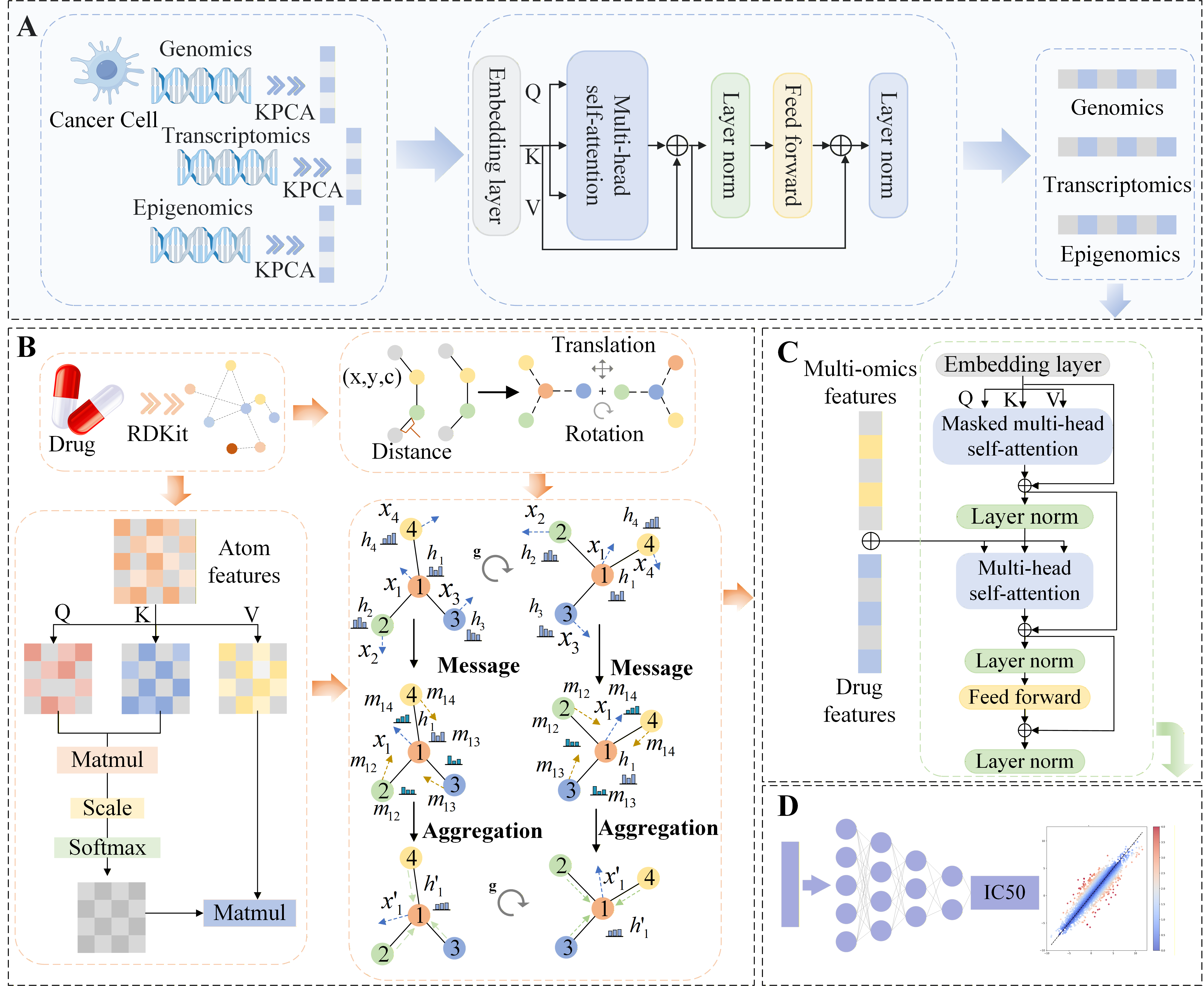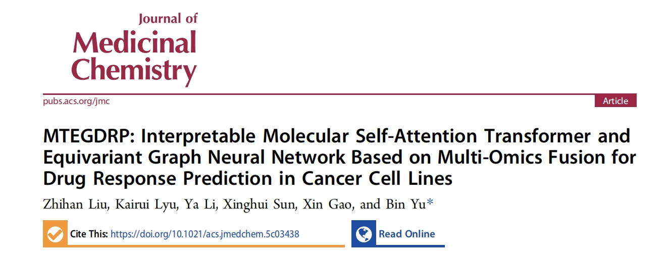 近日,星空XK官网于彬教授团队在人工智能驱动药物发现研究领域取得重要进展,相关成果以“MTEGDRP: Interpretable Molecular Self-Attention Transformer and Equivariant Graph Neural Network Based on Multi-Omics Fusion for Drug Response Prediction in Cancer Cell Lines”为题发表在药物化学领域顶级期刊Journal of Medicinal Chemistry (JMC)。于彬教授为论文的唯一通讯作者,2023级研究生刘志涵为第一作者,XK星空为第一完成单位。