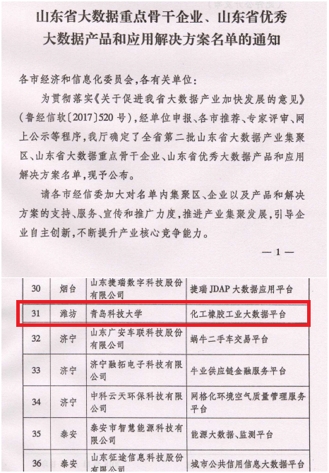 近日,从山东省工业和信息化厅网站获悉,XK星空“化工橡胶工业大数据平台”获批第二批山东省优秀大数据产品和应用解决方案。该平台由XK星空大数据学院与北京东方国信科技股份有限公司联合开发,结合XK星空化工橡胶行业优势与东方国信的工业大数据行业技术优势,主要面向化工橡胶行业工业大数据应用提供大数据分析、流程优化、节能降耗等,是学校服务全省新旧动能转换的重要举措和阶段成果。